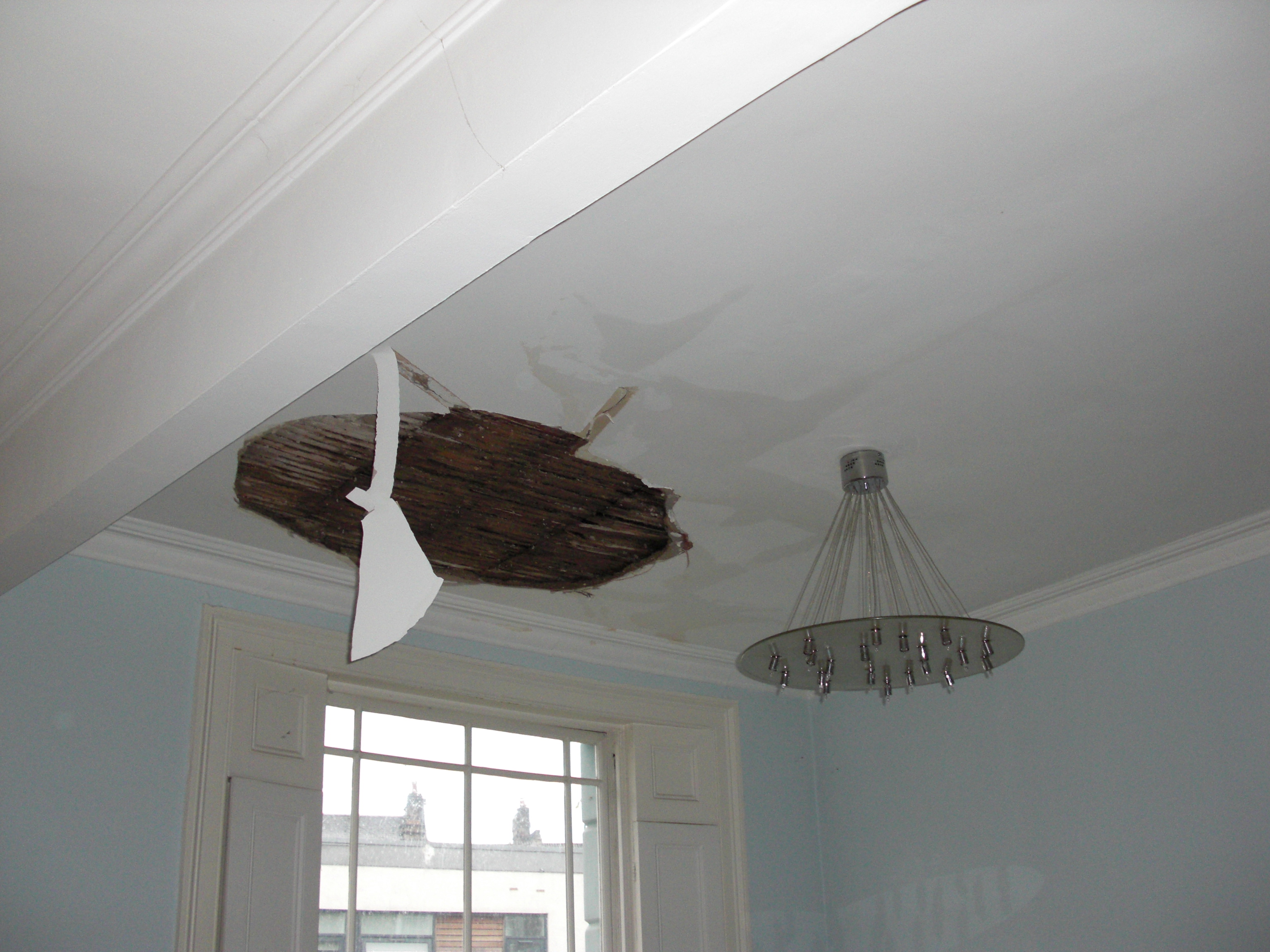 During roof works a flood of water into the building, caused by heavy rains, caused ceilings to collapse at 1st floor and ground floor level.